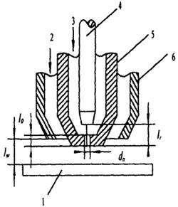 图1-7-5 钨极的内缩[2] dn.喷嘴孔径 l0.喷嘴孔道长度 lr.钨极内缩长度 lw.喷嘴至工件的距离 1.工件 2,保护气 3.等离子气 4.钨极 5.喷嘴 6.气罩 表1-7-1 不同直径喷嘴的许用电流[5]