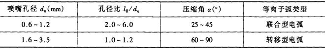 ②喷嘴孔道长度l0 在一定的喷嘴孔径下,l0越长,对等离子弧的压缩作用越强,但l0太大时,等离子弧不稳定。通常要求孔道比l0/dn在一定的范围之内,如表1-7-2所示。 表1-7-2 喷嘴的孔道比及压缩角[2]