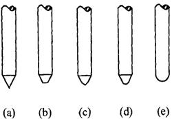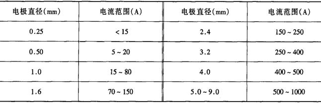 图1-7-6 电极的端部形状[5] (a)尖锥形 (b)圆台形 (c)圆台尖锥形 (d)锥球形 (e)球形 表1-7-3 不同直径棒状电极的许用电流[2]