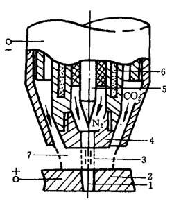 1—切缝;2~工件;3—等离子电唬4—喷嘴;5—阴极;6—冷却水;7—保护气体