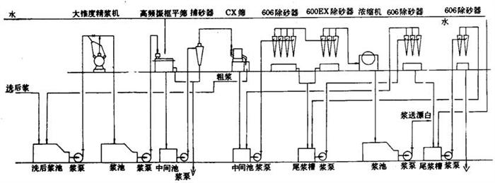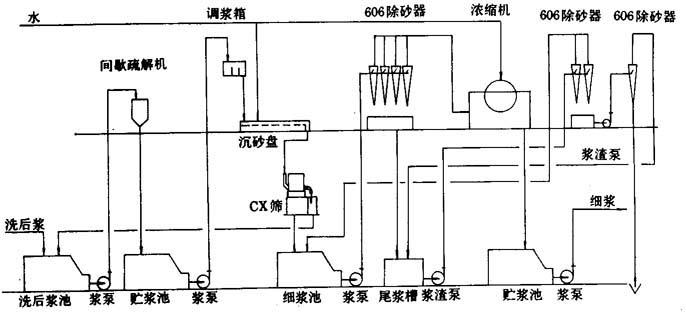 图5-7-12 流程二 2.筛选、净化方法与技术条件 (1)精浆机(乔登机) 进浆浓度:2.5~3.5%; 落刀负荷:140~180A。 (2)半浆机 疏解浓度:4%左右; 下刀方法:轻刀疏解; 疏解时间(h:min):2∶00。 (3)振框平筛 振次:1410~1440次/min; 振幅:1.5~2mm; 进浆浓度:1~1.5%; 出浆浓度:0.6~0.8%; 筛孔直径:5~6mm。 (4)沉砂盘 浆料浓度:0.5%左右; 浆料流速:12~15m/min。 (5)大型除砂器 压差:0.035~0.15MPa(0.35~1.5kg/cm2): 进浆浓度:0.5~1.0%。 (6)锥型除渣器(606型) 进浆浓度:0.5~1.0%; 进浆压力0.3MPa(3.0kg/cm2左右); 出浆压力:0.02~0.03MPa(0.2~0.5kg/cm2): 排渣口直径:<12mm。 (7)CX筛 进浆浓度:0.8~1.5%; 出浆浓度:0.5~1.0%; 转速:485r/min; 筛孔直径:1.8~2.4mm。 (8)浓缩机; 出浆浓度:3~4%。 3.质量指标 尘埃度:≤500mm2/500g; 砂粒杂物:不许有; 浓缩后浆料浓度:3~5%; 浆水含残碱(Na2O):10~20mg/L; 本色浆硬度KMnO4值:6~8。 |