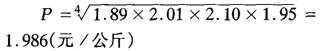 例如,某日4个市场上羊肉的价格分别为每公斤1.89元、2.01元、2.10元和1.95元,则该日市场上羊肉的简单几何平均价格为: