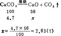 | 释义 | 简单化学反应式的计算 根据物料平衡原理,由原料量计算产品量。 工业产品上煅烧石灰石来制造生石灰(CaO),同时生成CO2。若煅烧含94%CaCO3的石灰石5吨,得到生石灰多少呢? 解:原料中纯CaCO3=5×94%=4.7(t)