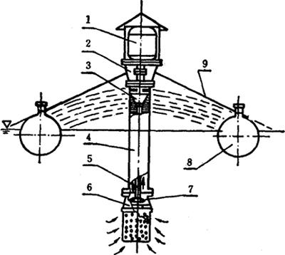 图5-5 YJG-150型管式桨叶增氧机示意图 1.电动机;2.电机座;3.上叶轮;4.槽管;5.主轴;6.吸口;7.下叶轮;8.塑料浮筒;9.支架 作为一种新式的增氧机,本机采用槽管-浆叶式,在管内叶轮的作用下,处于水体较深处的低氧水在管内被提升,以若干伞状流束从槽口强制喷出。空气被吸入水膜,水与空气激烈混合。形成高氧气。由于采用轴流浆叶式提水叶轮,具有较大的水交换量,能有效地实现上、下水层的交换,并在表层造成一定水跃,达到进一步增氧之目的。 (3)主要技术参数 配套功率 1.1(1.5) 千瓦 动力效率 750克/千瓦时 叶轮转速 1410 转/分 叶轮直径 Φ150 毫米 水交换量 125 吨/时 整机重量 90 公斤 (4)维护保养及故障排除 见表5-3。 表5-3 故障产生原因及排除方法