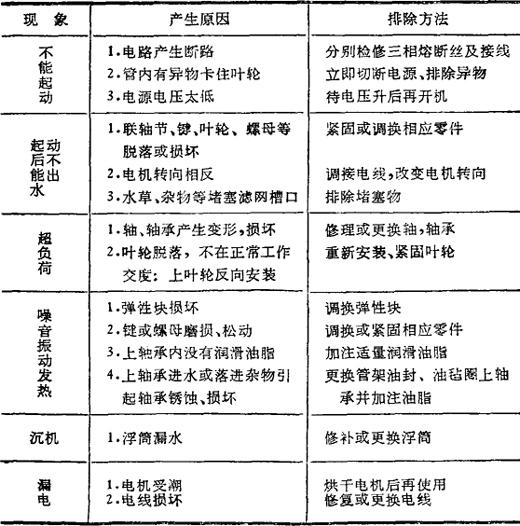 (5)使用时注意事项 ①在使用前应先检查机器,用手按动叶轮轴应灵活。上、下叶轮在轴上不应有松动现象。 ②电源应使用三相交流电,接线要牢固接线盒进出线处要加橡皮圈,严防进水,同时要安装接地线,防止发生漏电。在使用中,严禁用力拖曳电缆,严禁带电下水作业,下水前在岸上先接通电源试转,注意其转向应与箭头方向一致,如反转应在岸上调转接用。 ③本机用三个浮筒将机器浮撑在水面上,机器应用绳索系牢固定在适当位置,该处水深应不小于1.5米。 ④该机在水面位置,三根绳索形成三角形,应使槽管上的水位线正好处在水面(最后一条出水槽水面约12厘米)。注意要使机器与水面垂直,使机器处在最佳工作位置。其调节方法是通过往塑料浮筒中灌水来实现的,塑料浮筒水上部分最好用油布等遮盖,防止太阳直射加速老化,以延长使用寿命。 ⑤每年检修一次,拆换上、下轴承油封,加足润滑脂,不用季节应把机器放在通风干燥的地方,避免日晒、雨淋、防止机器受潮、锈蚀。 |