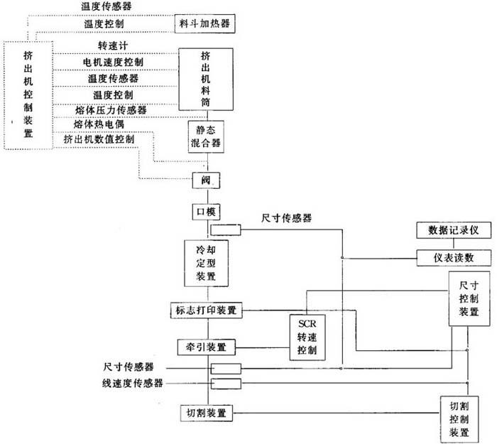 | 释义 | 管材生产线中控制系统 管材生产线中的控制系统包括温度、速度及挤出压力等控制设备以及冷却装置的温度及转速,牵引线速度,切割装置等的控制;还能对管材的壁厚变化及偏心率进行监测。另外,采用超声波裂纹检测器,可对管材壁质量进行跟踪监视。 在有些系统中,监测设备通常耦合成一循环控制系统,以便自动调节生产工艺,使制品的尺寸保持在较窄的范围内。 将循环控制引入牵引装置以保持尺寸稳定的能力取决于牵引装置本身——监测设备产生的错误信号能引起速度的变化,SCR驱动与变速交流电机驱动适用于此。在循环控制系统中还须考虑的一个因素是定型方法,采用真空定型或内部芯轴定型时,由定型装置的监测段所确定的某个尺寸是不变的,调节牵引速度只会影响壁厚。对外部定型而言,外径作为主控尺寸,而内径由速度变化来控制。但对内径定型来说,内径须以壁厚来监测,这种方法与外径监测器相比,对目前的监测传感器而言,有一定的难度。软质PVC的自由挤出方式只能控制一个方向的尺寸,其它尺寸会发生波动,并可反映出工艺条件的变化。在此,对制品进行适当的控制对维持挤出产量的稳定性是非常重要的。 在此,再回顾一下整个挤管系统,可认识挤出系统中各部件间的相互关系。这也是设计各种挤出系统的基本出发点。该系统的功能图解形式见图19-22。