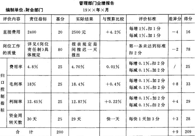 从财会部门编制的“管理部门业绩报告”中可以看出,财会部门19××年×月份管理责任指标都圆满完成了责任预算的规定。岗位工作除了报表编制不及时以外,其他方面均达到规定的要求,今后应加强报表编制环节的工作,做到及时编报各种报表,满足管理需要。财会部门存在的突出问题是对本部门直接费用控制不严使实际费用超预算100元,应该具体分析费用超预算的原因,并采用改进费用控制的具体措施努力降低管理费用支出。 |