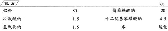 制法 按配比将次氯酸钠、氢氧化钠和十二烷基苯磺酸钠加入水中,搅拌混合使之溶解均匀,包装,备用。另外将铝粉和葡萄糖酸钠混合均匀,包装,即成两种组分的产品。 使用时,两种组分根据实际情况配合使用。 被油脂为主的杂物堵塞时,可只用粉体组分,约15min即可畅通;被毛发为主的杂质堵塞时,可只用液体组分,约30min畅通。 |
