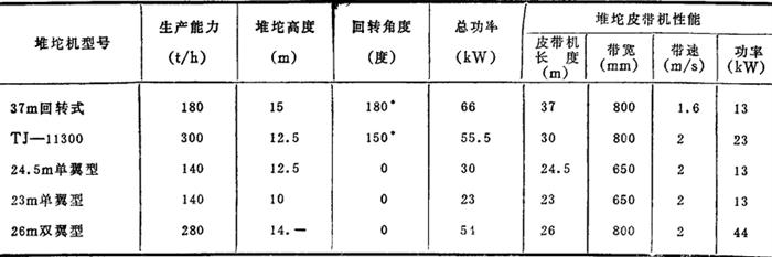 堆坨机的类型,按堆坨斜皮带机的数量,可分为单翼堆坨机和双翼堆坨机;按堆坨斜皮带机是否回转,分为固定式堆坨机和回转式堆坨机;按照行走方式,分为固定轨道式和履带式堆坨机。其共同点是堆坨、配重、回转机构均座落在底盘上,或沿固定双条形轨道移动,或自行移动,或固定不动沿扇形面堆坨。常用堆坨机的性能见表4-4-8。