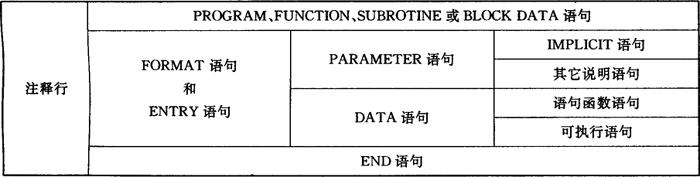 图3.2.1-1 FORTRAN源程序 (1)源程序构成 ①一个程序可以由一个或者若干个程序单位(主程序或子程序)组成。 ②每个程序单位均以“END”结束。 ③一个程序单位由若干行组成。每行只能写一条语句,一行写不下可以续行。各种语句在程序单位中的先后位置见表3.2.1-1。 表3.2.1-1 程序单位中语句和注释行的位置