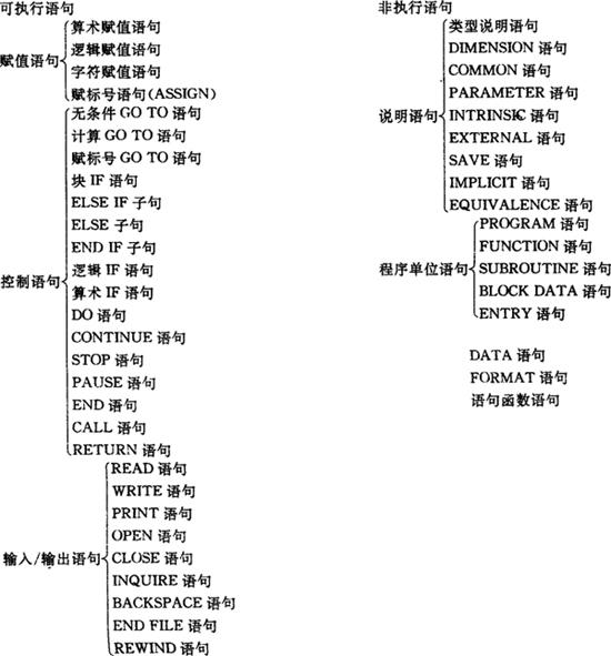 注:表中垂线分开的各语句可以交替出现,横线划定的为程序单位中各语句出现的顺序,是不容改变的。 ④FORTRAN的行有两种:语句行和注释行。 语句又分为执行语句和非执行语句,见表3.2.1-2。 表3.2.1-2 可执行语句和非执行语句