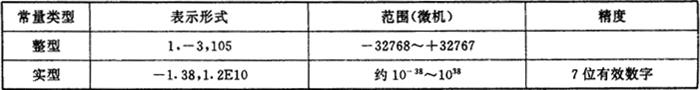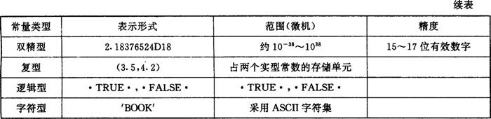 ⑤标准FORTRAN 77规定:程序中的所有字母均应大写。 (2)源程序的书写格式 源程序书写在80列范围内,分成4个区: ①标号区 1~5列。标号范围为1~99999。标号区中空格不起作用。凡第一列为字符“*”或字母“C”时,该行作为注释行。 ②续行标志区 第6列。凡在此列填入非零或非空格字符就表示该行为上一行的继续。一般一个语句最多可有19个续行。 ③语句区 7~72列。语句可以从该区的任何位置开始书写。 ④注释区 73~80列。该区的所有字符都按注释处理。 2.数据类型及常量 FORTRAN 77允许使用6种类型的常量,详见表3.2.1-3。 表3.2.1-3 常量类型