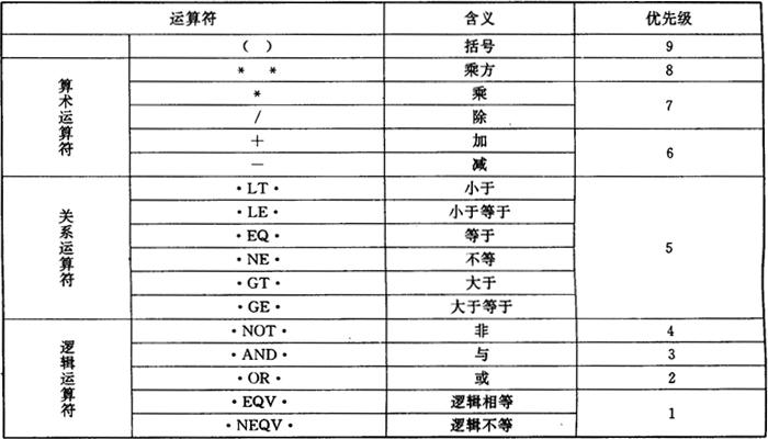 当一个运算符两边的运算数类型不一致时,总是先将级别低的类型转换为级别高的类型,再进行运算。类型等级由高到低依次为:复型→双精型→实型→整型。 (2)关系表达式 关系运算符共6个,详见表3.2.1-4。关系表达式中只允许出现一个运算符。当运算符两运算数类型不一致时,处理原则同算术表达式。 (3)逻辑表达式 逻辑运算符共5个,详见表3.2.1-4。 在一个逻辑表达式中往往包含算术运算符,关系运算符和逻辑运算符,它们的运算优先级见表3.2.1-4。 |