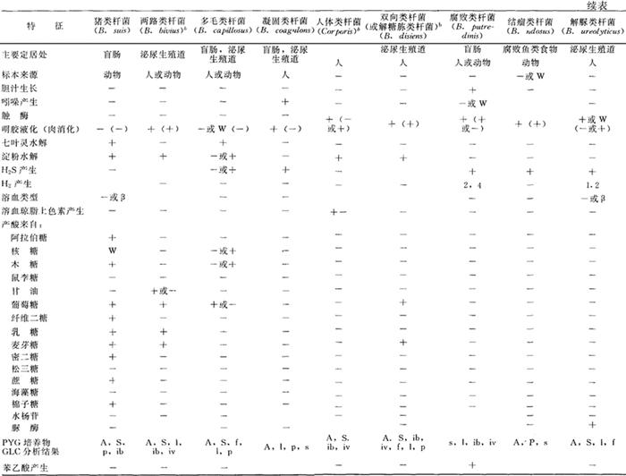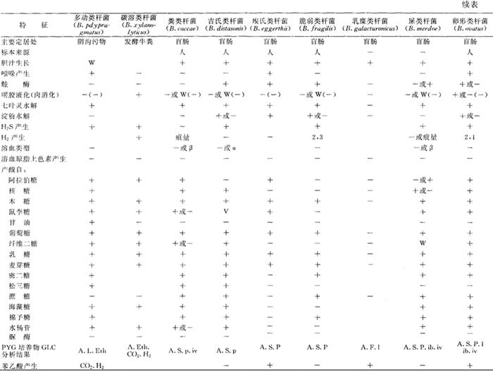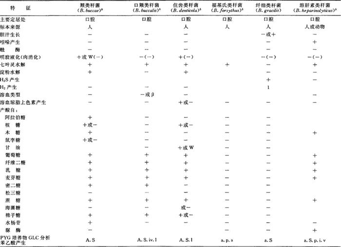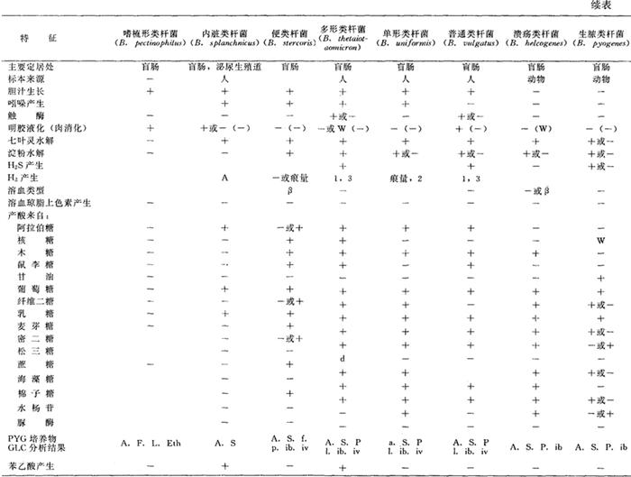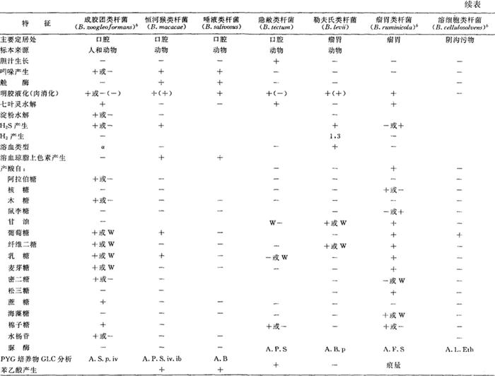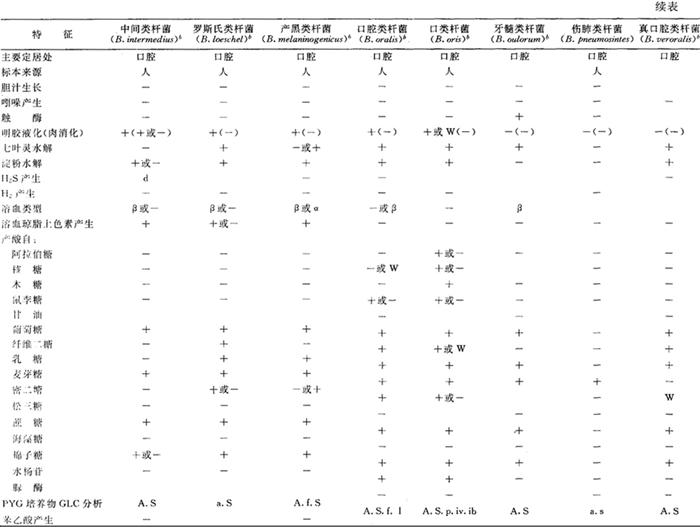 | 释义 | 类杆菌属的菌种鉴定 《伯杰氏手册编委会评议版》中类杆菌列有47个菌种,其中16个为新增菌种。 在本手册补遗的类杆菌菌种鉴定表中(表4-14),菌种名称上记有“b”的,根据评议版建议应称为普氏菌,即归入普氏菌属(Prevotella)。国内细菌名称未统一前可称为类杆菌,也可称为普氏菌,但以称普氏菌更为准确(见表4-14)。 表4-14 类杆菌属的菌种鉴定