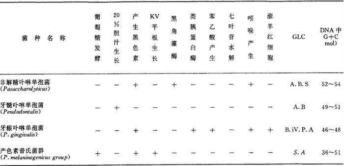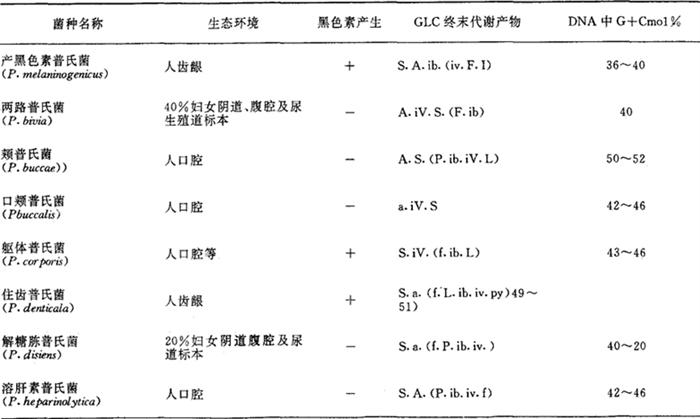 注:MDH为苹果酸脱氢酶;GDH为葡萄糖脱氢酶;G6PDH葡萄糖6磷酶脱氢酶;6GPGDH为6-磷酸葡萄糖脱氢酶 3.普氏菌属(Provotella) 普氏菌属是新增加的革兰氏阴性无芽孢厌氧杆菌属,包括16个菌种。这些菌种主要分离自口腔、阴道和牛羊瘤胃及粪标本中,也可从呼吸道、齿龈、阴道、腹腔或盆腔的临床标本中分离,其中有5个菌种产生黑色素。这些菌种原属于类杆菌属,根据其DNA中G+Cmo1%及同源性测定,已证实其属于新的菌属即普氏菌属,鉴别特征见表4-4。 表4-4 普氏菌属主要菌种的鉴别