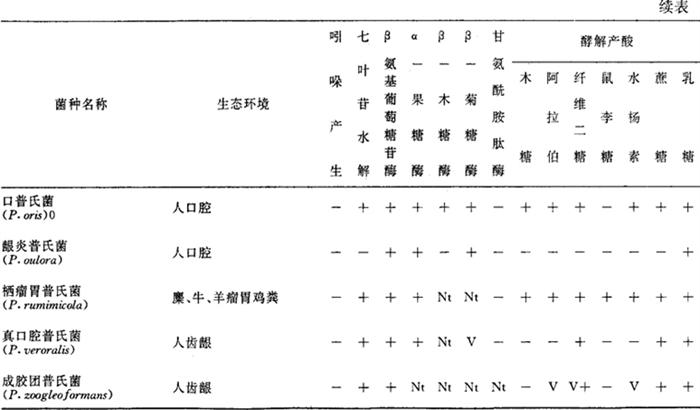 4.新菌属卟啉单孢菌属(Porphyromonas) 原产黑色素的类杆菌几个与口腔相关的菌种已划归新的菌属,称为卟啉单孢菌属。该属包括3个菌种,都与口腔疾病有关,该属菌种的鉴定列于表4-6中。 表4-5 普氏菌属主要菌种