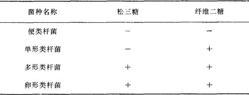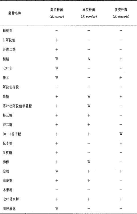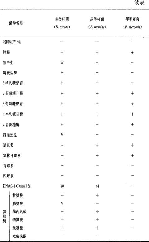 5.类杆菌属新增加3个菌种的主要鉴别特征 列于表4-7;粪类杆菌与吉氏类杆菌等鉴别列于表4-8中;便类杆菌与多形类杆菌的主要鉴别特征列于表4-9。 表4-7 类杆菌属新增加3个菌种的主要特征