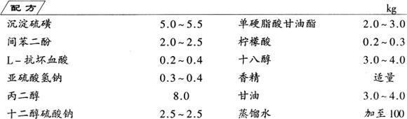 制法 (1)在搪瓷反应锅中加入配方量一半的蒸馏水,并加入十二醇硫酸钠,搅拌使之溶解,然后加入柠檬酸,升温至50~54℃,搅拌使之全部溶解。 (2)在另一搪瓷筒内加十八醇、丙二醇、甘油,用水浴加热使之溶解,在搅拌下加入硫磺。继续加热,温度维持在90℃左右,使硫磺均匀地溶解于醇中。然后将该混合物倒入(1)中的反应锅中,维持物料温度为45~55℃,充分搅拌,使物料分散均匀。 (3)将间苯二酚、L-抗坏血酸、亚硫酸氢钠,用剩余的1/2蒸馏水溶解后倒入(2)中混合反应锅中。控制物料温度在43~47℃范围内,充分搅拌,直至成为均匀的细腻膏霜,再加入香精,搅拌均匀,待温度升至室温,即得成品。 |
