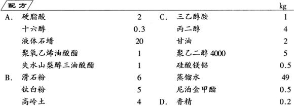 分别将A中的全部组分、B中的全部组分、C中的全部组分混合,加热至70℃,分别制成A组分、B组分和C组分。将B组分和C组分混合,进行研磨乳化分散,保持70℃。在搅拌下将B组分和C组分的混合液加入A组分中,进行乳化反应,当乳化分散混合均匀后,待温度降至35℃时,加入D组分的香精,充分混合均匀,即成产品。