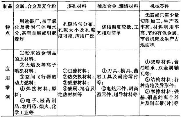 | 释义 | 粉末冶金概述 粉末冶金既是制取金属材料的一种冶金方法,又是制造机器零件的一种加工方法,粉末冶金从制取金属粉末开始,将所设计粉末均匀混合,经过成型、烧结,制成粉末冶金材料或零件,根据需要,还可对所得材料或零件进行后处理. 用粉末冶金技术制造的金属材料或制品,叫做粉末冶金材料或制品,制备粉末冶金制品的主要工艺过程是粉料制备、成型和烧结,表6-1列出了粉末冶金制品的特点及应用情况. 表6-1 粉末冶金制品的特点及应用情况
