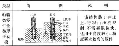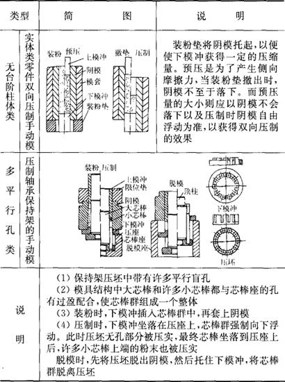 | 释义 | 粉末冶金模具的结构 粉末冶金模具结构主要分成型模与整形模两大类。 (一)成型模 成型模的分类及结构示例见表6.1-1。 表6.1-1 成型模分类及结构