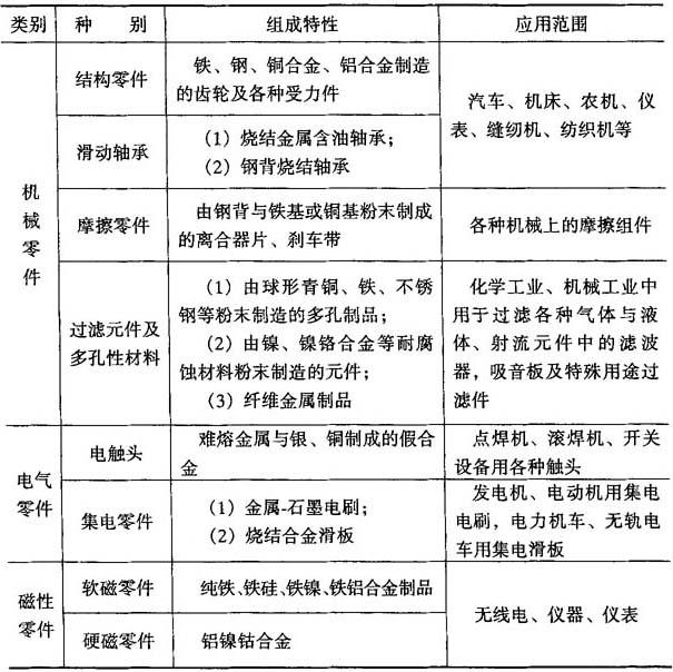 | 释义 | 粉末成形 粉末成形(即粉末治金)是以金属、金属化合物或非金属粉末为原料,经过压制和烧结制造各种制品的成形工艺.粉末成形由于其节约材料、切削工作量大量减少、劳动生产率提高以及生产成本降低等优点而在机械制造业中获得日益广泛的应用.目前,利用粉末制造的各种材料和制品可概括地分为两大类:一类为只能用粉末成形方法制造的各种材料和制品,如烧结硬质合金、铜钨假合金、多孔性金属材料和制品等;另一类是利用粉末成形方法制造代替铸、锻、切削加工生产的各种制品,如各种套环、齿轮、凸轮及异形件等,如表1-8所示. 表1-8 粉末成形制品举例