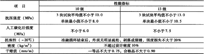 图7-4 粉煤灰砌块各部位的名称 1-角;2-棱;3-座浆面;4-侧面;5-端面;6-灌浆槽 根据外观质量和尺寸偏差可分为一等品(B)和合格品(C)两种。粉煤灰砌块按抗压强度不同,可分为10级和13级两个等级。粉煤灰砌块的抗压强度、人工碳化后强度、抗冻性能和密度应符合表7-22的规定。 表7-22 粉煤灰砌块的性能指标