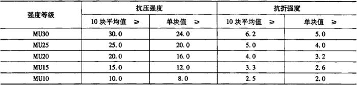 注:在条面或顶面上破坏面的两个尺寸同时大于10mm和20mm者为非完整面。 (2)色差 色差应不显着。 (3)强度等级 强度等级应符合表3-31的规定,优等品砖的强度等级应不低于MU15。 表3-31 粉煤灰砖强度指标MPa