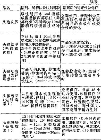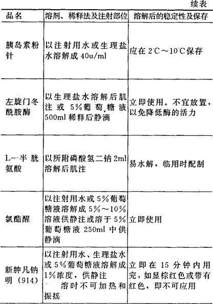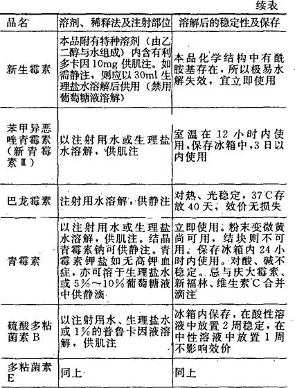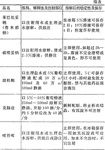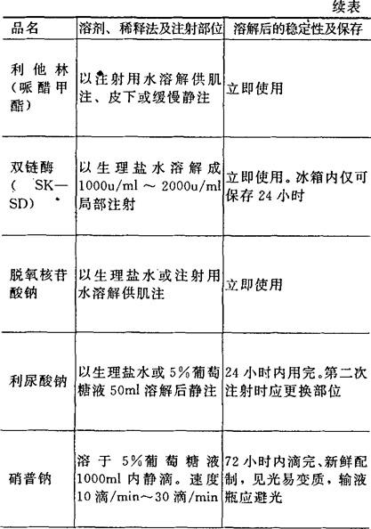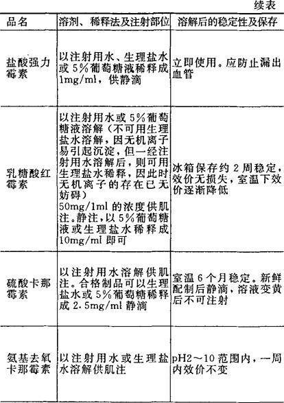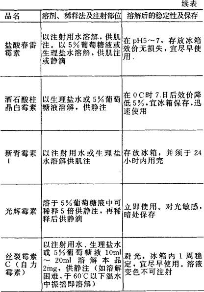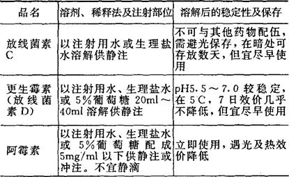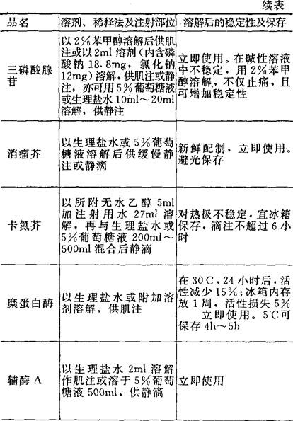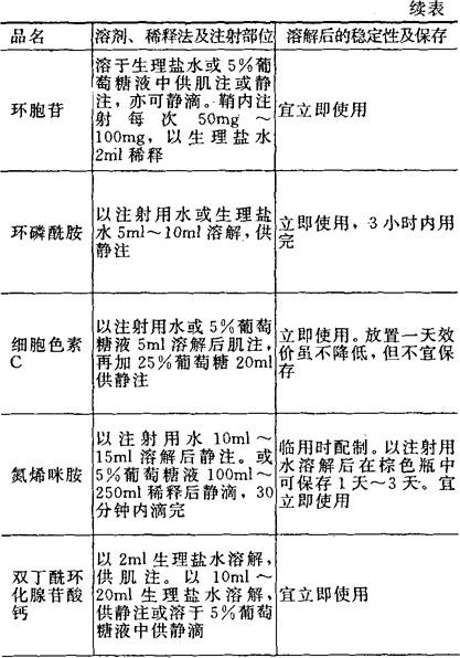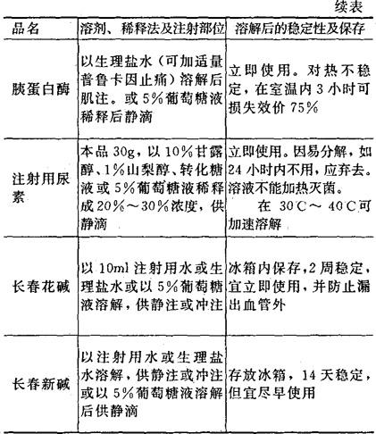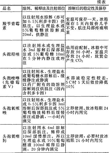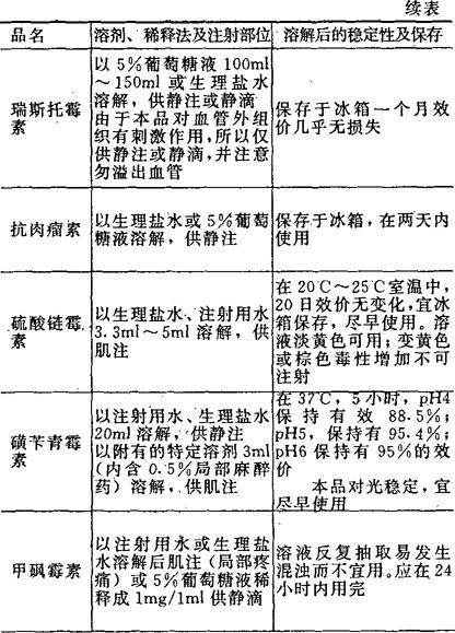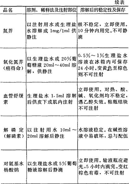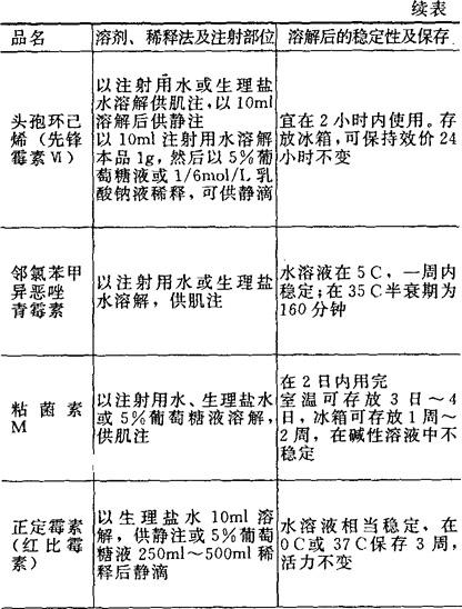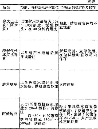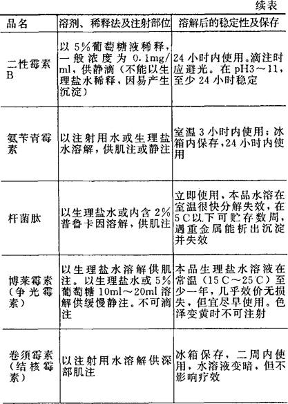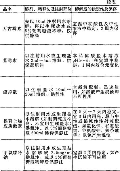 [备注]1.本表所表明溶解后的稳定性及保存期限,系指在无菌条件下未被微生物污染的,否则即应弃去,不可再用。 2.用注射器将已溶解的药液加入正在输注的注射液胶管中,称为冲注。 |