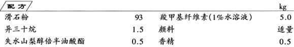 先将滑石粉、颜料在混料机内充分搅拌,得粉料,再将失水山梨醇倍半油酸酯、香精溶于异三十烷,然后加于粉料中,再加入羧甲基纤维素,用粉碎机粉碎后,压缩成型,即为产品。该粉饼与普通粉饼相比,黏合剂中油分少。