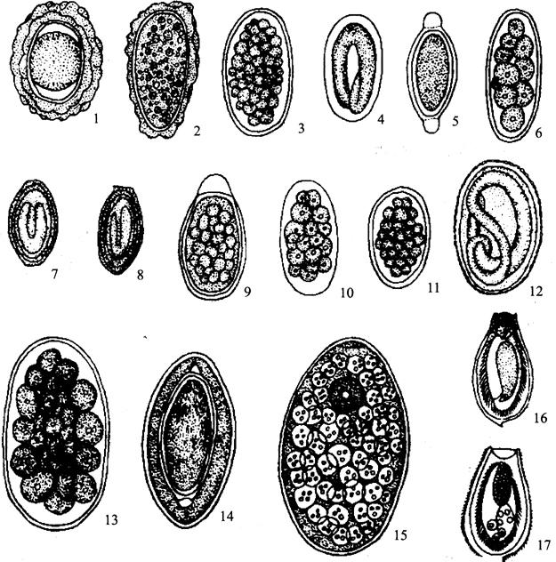 图1-20(一) 猪体内的寄生虫虫卵形态 1.猪蛔虫卵 2.猪蛔虫的未受精卵 3.猪结节虫卵 4.蓝氏类圆线虫卵 5.猪鞭虫卵 6.红色猪圆虫卵 7.螺咽胃虫卵 8.环咽胃虫卵 9.刚棘颚口线虫卵 10.球首线虫卵 11.鲍杰线虫卵 12.猪肺虫卵 13.猪肾虫卵 14.猪棘头虫卵 15.姜片吸虫卵 16.华支睾吸虫卵 17.截形微口线虫卵