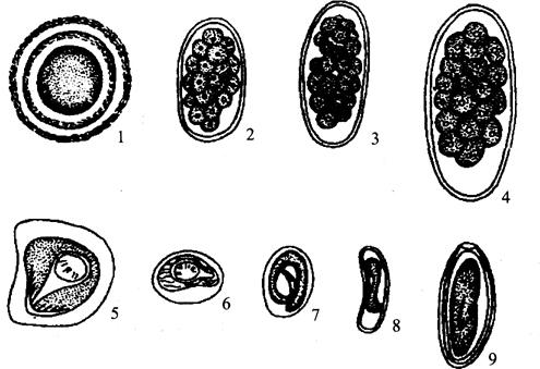 图1-20(二) 马体内的寄生虫虫卵形态 1.马蛔虫卵 2.圆形线虫卵 3.毛线虫卵 4.细颈三齿线虫卵 5.裸头线虫卵 6.侏儒副裸头线虫卵 7.韦氏类圆线虫卵 8.柔线虫卵 9.马蛲虫卵