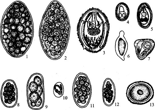 图1-20(四) 牛体内的寄生虫虫卵形态 1.肝片形吸虫卵 2.前后盘吸虫卵 3.日本血吸虫卵 4.双腔吸虫卵 5.姨阔盘吸虫卵 6.东毕血吸虫卵 7.莫尼茨绦虫卵 8.结节虫卵 9.钩虫卵 10.吸吮线虫卵 11.指形长刺线虫卵 12.古柏线虫卵 13.牛蛔虫卵