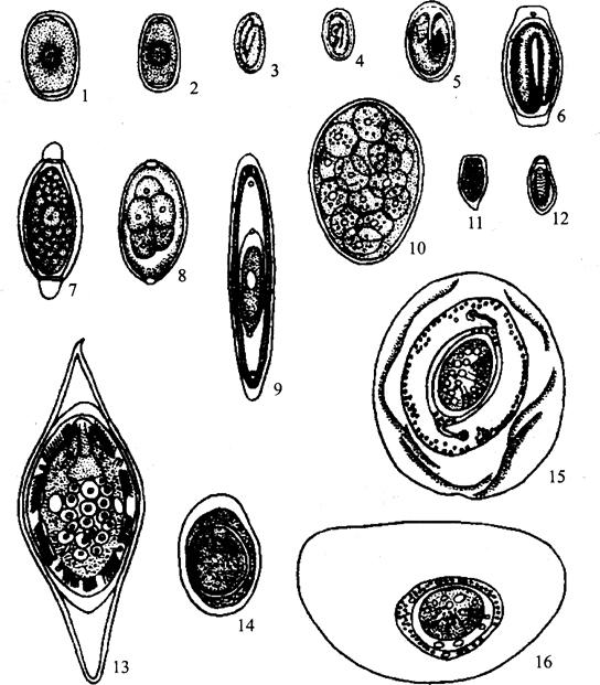 图1-20(五) 禽体内的寄生虫虫卵形态 1.鸡蛔虫卵 2.鸡异刺线虫卵 3.鸡类圆线虫卵 4.孟氏眼线虫卵 5.螺状胃虫卵 6.四棱线虫卵 7.毛细线虫卵 8.比翼线虫卵 9.多型棘头虫卵 10.卷棘口吸虫卵 11.前殖吸虫卵 12.次睾吸虫卵 13.毛毕吸虫卵 14.有轮赖利绦虫卵 15.矛形剑带绦虫卵 16.片形皱褶绦虫卵
