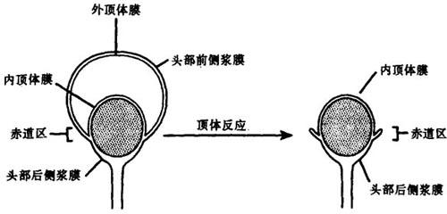 | 释义 | 精卵相遇及受精 获能 顶体反应 透明带结合 从男性生殖道射入女性生殖道内的精子在受精前需要运行一段距离和穿过许多屏障。精子刚进入女性生殖道时没有受精能力。但是,精子在女性生殖道完成了“获能”这一成熟过程。获能时,精子膜及精子代谢发生变化,但其全部过程尚不清楚。精子获能以后,运动形式改变,呈现高度活跃状态,并且具备发生顶体反应的能力。 顶体反应 顶体反应是一种钙离子激活的精子头部细胞膜发生变化的细胞排粒作用。精子顶体外膜及其相贴的精子质膜发生众多的点状融合,形成许多小泡,顶体液体内容物释放,顶体内膜暴露。暴露的顶体内膜和精子头部后体质膜,形成精子发生顶体反应后的质膜(图11-1)。在质膜融合中,膜蛋白发生不完全混合。顶体富含透明质酸酶、蛋白酶、顶体素,这些物质在精子穿过卵子外膜过程中发挥作用。顶体反应形成的小泡表面也含有透明质酸酶、蛋白酶和顶体素。暴露的顶体内膜含有的分子物质在为精子穿过卵子外膜开劈一条通道过程中起消化作用或在精子与透明带结合过程中发挥作用。