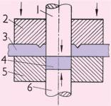 V形环精密冲裁工作原理图1.冲头2.V形环压边圈3.板料4.工件5.凹模6.顶杆 |