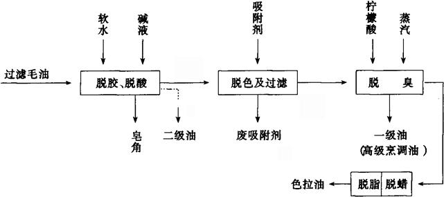 | 释义 | 精炼油加工装备 1 概述 精炼油加工装备是去除毛油中各种杂质,并加工成不同用途精炼油产品的设备。根据精炼油脂时的操作特点,以及精炼所用的材料与杂质相互作用的不同,可将油脂精炼分为机械法、化学法和物理化学法等三类。机械法包括沉降、过滤和离心分离等,用来分离悬浮在粗油中的固体杂质及部分胶溶性杂质;化学法包括碱炼、酸炼、酯化、氧化还原脱色等,一般常用前两种方法,酸炼主要除去色素、蛋白质和醣类等;物理化学法包括水化、吸附脱色、脱臭、蒸馏法以及液-液萃取法精炼等。 上述精炼方法均需通过相应的装备来实现。从装备的形式来分有间歇式、半连续式、连续式精炼设备。上述设备分别适用于日加工毛油量20t以下、20~50t和50t以上的规模的厂家。 2 油脂精炼工艺 油脂精炼的工艺流程见图1-3-23。该工艺流程可以适用间歇式精炼设备,也可以适用半连续或连续式精炼设备。由于脱胶与脱酸有时单独进行,但大多情况下是同时进行,所以在图1-3-23中列为同一工序。以下按工序作简要说明。