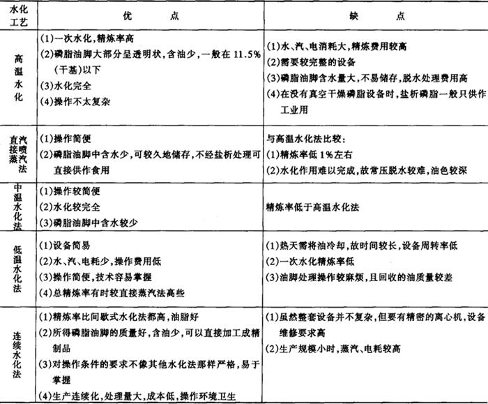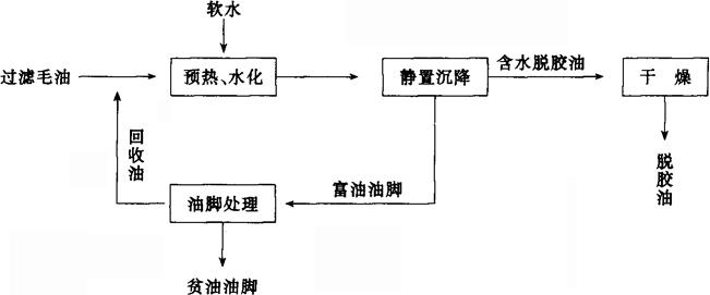 图1-3-23 精制油精炼工艺流程 2.1 脱胶 将毛油中的胶溶性杂质脱除的工艺过程称为脱胶。脱胶的方法分为水化脱胶、吸附脱胶、热聚脱胶、化学试剂脱胶及工业用油的酸炼脱胶等。应用最多的是水化脱胶。 水化脱胶是利用磷脂等胶溶性杂质的亲水性,将一定量的热水或稀碱、食盐、磷酸等电解质水溶液,在搅拌的同时加入热毛油中,使胶溶性杂质凝聚、沉降、分离。在水化脱胶过程中,被凝聚沉降的主要是磷脂。此外,尚有与磷脂结合在一起的蛋白质、粘液物和微量金属离子等。在间歇式水化法中,又可分为直接蒸汽喷汽法、高温水化法、中温水化法和低温水化法等,其各自的特点见表1-3-7。间歇式水化法脱胶工艺流程见图1-3-24,主要设备有水化罐、沉降分离器、干燥器和油脚处理设备等。 表1-3-7 几种水化脱胶工艺的特点