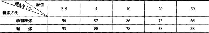(2)连续碱炼脱酸工艺 由于采用离心分离机,可以将碱与油混合后产生的皂脚与油连续分离。其过程是混合搅拌,连续分离、洗涤、干燥等。在操作中,由于油与碱接触时间短,选定操作温度关系到分离效果。一般先混合后加热的工艺,初温控制在50℃左右,分离温度根据毛油品质可掌握在75~90℃。对于先加热后混合的工艺,操作温度控制在85~95℃。连续碱炼脱酸工艺的主要设备是离心脱皂机、离心脱水机、混合机、油碱配比机、真空干燥机、蒸汽喷射泵等。该工艺的全部生产过程是连续进行的,操作简便,具有处理量大,精炼率高,精炼费用低,环境卫生好,精炼油质量稳定,经济效益显着,它是精炼工艺主要的发展方向。 (3)泽尼斯碱炼工艺 它是适合低酸值毛油精炼的一种先进工艺。具有设备简单、成本低、精炼效率高、无噪声等特点。它是将脱胶油加热到60~80℃,进入泽尼斯中和塔下部,通过油珠分布器,使油成为0.5~2mm的油柱和油珠,上升穿过稀碱液层。在穿越稀碱液过程中能充分中和脱酸。脱酸油由塔上部的恒位口流出。碱性皂液可经塔底部阀门放出。在中和过程中,随时补充碱液以保持恒定浓度。当碱、皂液中苛性钠达到一定浓度时,则要更换新碱液。 (4)表面活性剂碱炼工艺 它是在脱胶油中加入表面活性剂海尔活本(Halr openor),利用其选择性溶解特性,以降低炼耗率、提高精炼率的碱炼工艺。在碱炼过程中,海尔活本溶液能选择性地溶解皂脚和脂肪酸,减少皂脚包容油的损失。由于皂脚的稀释,即使增加搅拌强度,也不会出现乳化现象。所以用增加搅拌强度可以代替或减少部分超量碱。减少中性油被皂化的几率,可获得较高的精炼率。该工艺获得的皂脚质量高,脂肪酸含量可高达93%~94%。对酸值高的油也能获得较好的精炼效果,还能简便地连续分解皂脚,回收海尔活本循环使用。另外,排出的废水呈中性,不污染环境。 (5)浸出混合油碱炼工艺 即将溶剂浸出后油与溶剂的混合液(俗称混合油)直接进行碱炼脱酸。特点是中性油皂化率低,皂脚夹油少,精炼效果好。由于消除了毛油在精炼前的增色因素,有利于油脂品质的提高,并能减轻混合油溶剂的蒸脱负荷及提高最后汽提温度。混合油碱炼工艺具有广阔的前景。其工作过程是将混合油先加热浓缩到浓度40%~65%,再加碱及其他添加剂进行中和,然后采用连续沉降或密闭离心机分离皂脚,精炼后的混合油再送去蒸发汽提。混合油碱炼工艺有间歇式和连续式两种。间歇式混合油精炼设备主要有密闭式精炼罐、密闭式离心机等。连续式混合油精炼设备主要有沉降分离器、离心分离机、静态混合器、中和反应器、碱比例泵、洗涤塔等。 上述各种碱炼工艺目前都有应用。在保证精炼质量前提下,几种毛油损耗指标(%)如下: 豆油:2x+1 葵花油:2x+0.5 棉籽油(品质较好):2x+0.9 棉籽油(劣质):3.9x 菜籽油:3x x——毛油的游离脂肪酸质量分数 2.2.2 物理精炼 物理精炼是借助于水蒸气蒸馏分离油脂中的游离脂肪酸的一种脱酸方法。在同一条件下,游离脂肪酸与油脂(即甘三酯)的蒸汽压差较大,这种特性为蒸汽蒸馏分离游离脂肪酸的方法提供了依据。各种碱炼工艺都是用碱中和游离脂肪酸,所以共同缺点是:需要耗用碱、盐、表面活性剂等物料;一部分中性油不可避免地被皂化;从皂脚中回收脂肪酸困难;废水污染环境;高酸值毛油碱炼损耗很大。物理精炼避免了以上缺点,具有工艺流程简单,原、辅料损耗少,处理量大,精炼率高,产品稳定性好,可直接获得高质量的副产品——脂肪酸,没有废水污染等优点。表1-3-10所示为同一酸值油物理精炼与碱炼的精炼率。 表1-3-10 同一酸值油物理精炼与碱炼的精炼率