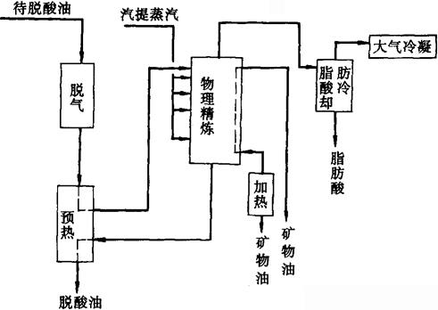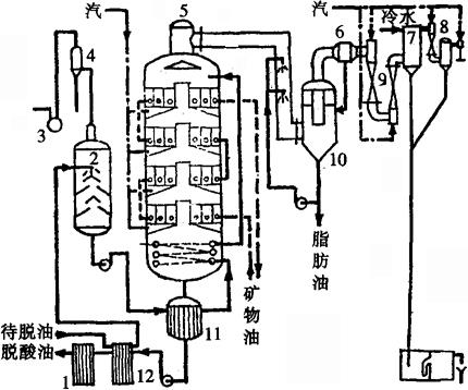 物理精炼工艺分为间歇式和连续式。间歇式在蒸馏釜中进行蒸馏脱酸。连续式是在蒸馏塔中进行蒸馏脱酸,其工艺流程与设备见图1-3-26。一般蒸馏温度为220~260℃,操作压力为0.15MPa。