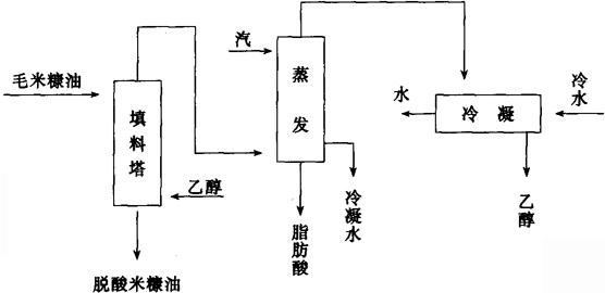 图1-3-26 物理精炼工艺流程 2.2.3 溶剂萃取法 溶剂萃取法是根据毛油组成中各种物质的结构、极性不同及相似相溶的原则,选择某种溶剂,在一定温度下来溶解油脂中的游离脂肪酸,并将其分离。已用于生产的溶剂有乙醇、糠醛等。这种方法的设备简单,操作费用低。但存在操作不够稳定的缺点,正在完善过程中。以米糠为例,其工艺流程见图1-3-27。