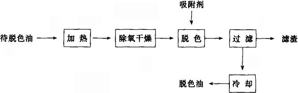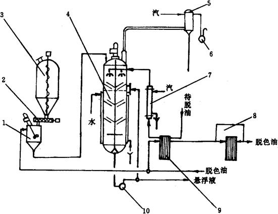 图1-3-27 米糠毛油液-液萃取工艺流程 2.3 脱色 纯油脂(即甘油三酸酯)是无色的。各种天然油脂都带有色泽,这是由于混杂有油溶性的色素造成的。脱除油中色素,改善油脂色泽的过程称为脱色工艺。脱色方法分物理法(液一液萃取法等)、物理化学法(吸附法、加热法)、化学法(酸炼法、碱炼法、氧化法、还原法等)。应用最多的是吸附脱色法。而化学试剂脱色法不适用于食用油的精炼。 2.3.1 吸附脱色 利用具有较强选择性吸附作用的漂土、活性白土、活性炭等物质,在一定条件下吸附油脂中的色素及其他杂质,达到脱色的方法称为吸附脱色。吸附脱色分为间歇式与连续式。间歇式是在脱色罐中加入吸附剂,在一定温度下吸附色素,然后送去过滤,分离出废白土后成为脱色油。吸附脱色时单独用活性白土时,添加量为油量的2.5%~5%,活性白土与活性炭混合使用时,活性白土的用量为1%~3%,活性炭为0.25%~0.5%。具体操作时要通过小样试验确定。间歇式吸附脱色的主要设备是脱色罐与过滤机。 连续脱色的工艺流程见图1-3-28。主要设备有脱色塔、振动过滤机等。此外,还有管式连续吸附脱色工艺,这是近代出现的一种脱色工艺。特点是反应条件稳定,产品质量一致。主要设备有管式反应器、过滤器、除氧干燥器等。