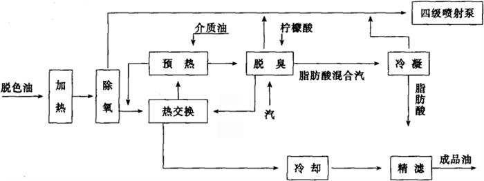 图1-3-28 连续脱色工艺流程 两段连续脱色工艺是将待脱色油与吸附剂滤饼完成吸附平衡后,再按常规法与定量比配添加的吸附剂连续完成吸附平衡的工艺,又称连续式预脱——复脱工艺。即利用复脱的过滤饼的剩余活力进行预脱,循环进行。脱色效果较好,吸附剂用量少。 2.3.2 其他脱色法 与吸附脱色相比,其他方法既有优点,又有使用局限性。例如:光能脱色法仅适用于蓖麻油、亚麻油和漆脂等工业油脂的辅助脱色;热能脱色法仅适用于棕榈油、椰子油等脱色;空气脱色法仅适用于类胡萝卜素含量高的油脂(棕榈油)的辅助脱色。另外,酸炼脱色与碱炼脱色一般结合脱酸工艺进行,不单独进行脱色。 2.4 脱臭 纯粹的甘油三酸酯是无味的,而压榨油或浸出油都含有强度不等的各种气味,除去这些气味称为脱臭。天然油脂中,臭味组分的含量较低,这些组分的挥发度与油脂的挥发度差别较大,所以一般可通过添加辅助剂(惰性气体),在真空高温下蒸馏脱除。脱臭过程中可以兼并脱除游离脂肪酸、过氧化物和一些热敏色素,以及某些残留农药等,从而使得油脂稳定度、色度和品质有所改善。因此,脱臭在油脂精炼中占有重要地位。 影响脱臭的因素有温度、真空度、通气速率与时间、脱臭设备的结构等。一般蒸馏温度控制在240~270℃,载热体进入设备的温度不超过280℃。为了控制不引起飞溅的最大喷汽速率,脱臭塔的操作压力应为270~400Pa,直接蒸汽喷汽量一般控制在占油量的5%~15%(间歇式)、4.5%(半连续式)和4%左右(连续式)。间歇式脱臭时间一般为2.5~4h,当用180℃的低温脱臭时,脱臭时间为5~8h。半连续脱臭时,当操作压力270~1064Pa、温度240~280℃时,油脂在脱臭塔内停留时间10~135min,时间以脱臭油品种和脱臭塔类型而定。连续脱臭时,油脂在脱臭塔中流经时间约80min。 脱臭工艺可根据生产规模,对产品的要求及经济力量,选择间歇式、半连续式和连续式脱臭工艺。 间歇式脱臭工艺是将油脂分批脱臭,主要设备是间歇式脱臭罐。 半连续脱臭工艺是在间歇式脱臭基础上发展起来的,所以主要设备是多层结构的脱臭塔。 连续脱臭工艺流程见图1-3-29。主要设备有脱臭塔、介质油加热系统、喷射泵、精滤器、析气器、脂肪酸捕集器等。
