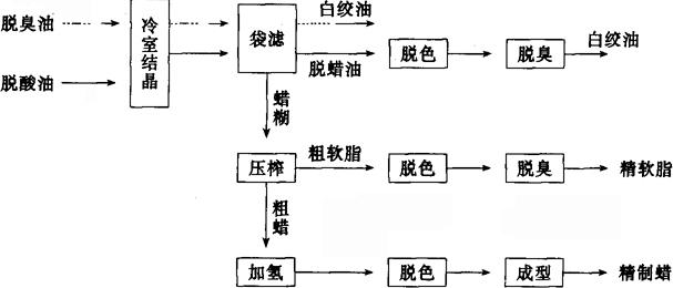 图1-3-29 连续脱臭工艺流程 2.5 脱蜡 米糠油、葵花油、棉籽油、玉米油、菜籽油等均含有一定量的蜡质。脱除油脂中的蜡质称为脱蜡。蜡的特性是在30℃以下,溶解度降低,析出蜡晶粒成为油溶胶。所以,根据蜡与油脂的熔点差及蜡在油脂中的溶解度,通过冷却析出晶体蜡,经过滤或离心分离达到脱蜡目的。 脱蜡方法有常规法脱蜡、溶剂脱蜡、表面活性剂脱蜡、综合法脱蜡等。 2.5.1 常规脱蜡法 常规脱蜡法是靠冷却结晶、过滤分离出蜡的工艺,不需加任何助晶剂及辅助手段。图1-3-30所示为冷冻袋滤法脱蜡工艺流程。常规法脱蜡的优点是设备简单,投资省,操作容易。缺点是油分离慢,脱蜡油得率低,浊点高,软脂纯度较差。常规脱蜡法的主要设备有结晶罐、养晶罐、蜡饼处理罐、过滤设备等。
