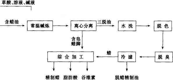 图1-3-30 冷冻袋滤法脱蜡工艺流程 2.5.2 综合法脱蜡 综合法是将脱蜡、脱酸通过一次或二次碱炼,并采用管式离心机分离油、皂的常温碱炼脱蜡工艺,其工艺过程见图1-3-31。碱炼温度为23~25℃,先加入占油量7%的草酸水溶液,搅拌10/min后加入占油量0.5%的碱液,反应50min后送入管式离心机分离油、皂。油经水洗、脱色、脱臭后在5℃左右的冰水罐冷冻3~5h,压滤得到脱蜡精制油。