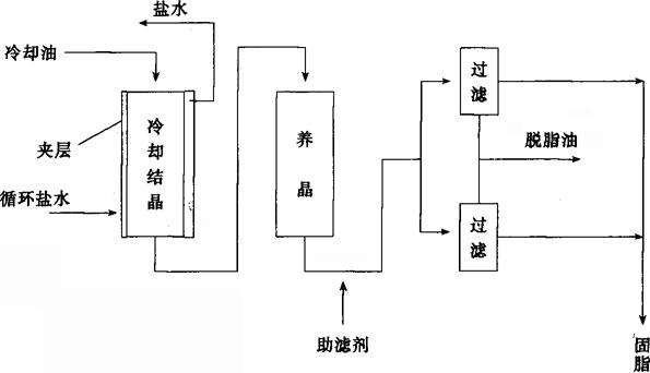 图1-3-31 综合法脱蜡工艺流程 2.5.3 溶剂法脱蜡 溶剂法脱蜡是在蜡晶析出的油中添加选择性溶剂(己烷、乙醇等),然后进行蜡、油分离和溶剂蒸脱的工艺。此法可得脱蜡油93%~97%,粗蜡4%~7%,经济效益高。但工艺流程长,设备复杂,溶剂损耗多,并影响后续脱脂工艺的质量。 2.6 脱脂 天然植物油主要由多种甘油三酯组成。甘油三酯中脂肪酸碳链长度、不饱和程度、双链构型及位置的不同,构成了物理、化学性质上不同的组分,它们的熔点不同。利用它们熔点不同的特性,通过降温结晶、分离出液态油及固体脂称为脱脂。天然油都是油和脂组成的,所以通称油脂。色拉油必须进行脱脂。 脱脂方法有常规法、溶剂法、液一液萃取法和界面活性剂法等。蒸馏法目前还在实验过程中。 2.6.1 常规法脱脂(即冬化) 常规脱脂法即油脂在冷却结晶(冬化)和晶、液分离过程中,不辅加其他措施的一种脱脂工艺,有时也称“干法”脱脂。 冬化分为间歇式和连续式。间歇式是在类似脱蜡的设备中进行,即在冷冻结晶塔中进行冷冻结晶、养晶,加助滤剂后送去压滤或真空吸滤。连续冬化工艺流程见图1-3-32。冬化工艺和设备较简单,但脱脂效率低,固体脂和液态油的品级低。
