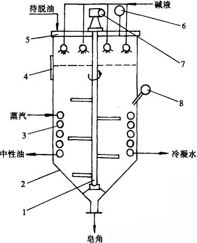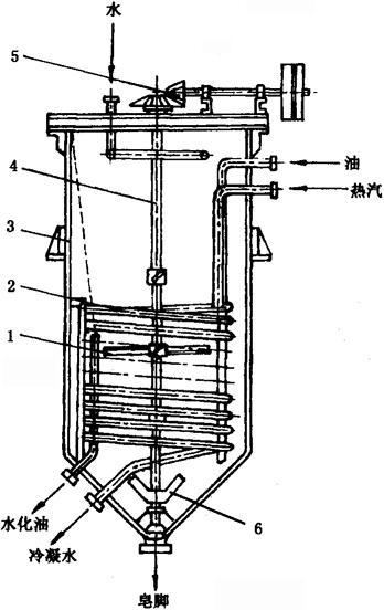 图1-3-33 蛇形管加热式水化罐 1-搅拌翅 2-蛇形管 3-罐体 4-轴 5-齿轮 6-特形搅拌翅 3.2 脱酸设备 3.2.1 炼油罐 不论哪种间歇式碱炼工艺,其主要设备是炼油罐(中和罐)再加配套设备,如配碱箱、水箱、水洗罐、干燥罐等。 炼油罐的形式见图1-3-34,可通用于中和、洗涤及干燥等工序,也可用于水化脱胶。我国标准炼油罐的上部呈半球状。
