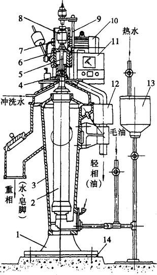 图1-3-34 炼油罐 1-搅拌轴 2-罐体 3-蛇形管 4-油位计 5-上盖 6-真空压力表 7-传动装置 8-温度计 3.2.2 连续碱炼设备 连续碱炼最主要的设备是离心机。其他为配套设备,如混合机、油碱配比机等及通用设备,如热交换器等。离心机分为管式离心机和碟式离心机。碟式离心机参见第1篇第14章第1节。管式离心机是一种管状无孔转鼓悬于挠性轴上的高速离心设备,转鼓转速为15000r/min,主要用来分离油和皂脚。也用于洗涤后离心脱水。工作时,油-皂悬浮液由下部进入转鼓,依靠旋筒旋转离心力,重相皂脚沿转鼓内壁上升,从出皂口排出。轻相油则沿轴线上升,由转鼓上端空心轴的出油孔射出,汇入油斗,经出油口流出。油皂分离或油水分离主要是通过更换不同规格的分隔圈进行调节。管式离心脱水机只是转鼓重相出口略有不同,机壳上没有出皂口。 管式离心机结构简单,运行可靠,易损件更换方便。但该机容量小,效率低,噪声大,不适宜处理固相含量大的悬浮体,适用于小型油厂。碟式离心机则广泛应用于大中型油脂工业企业。