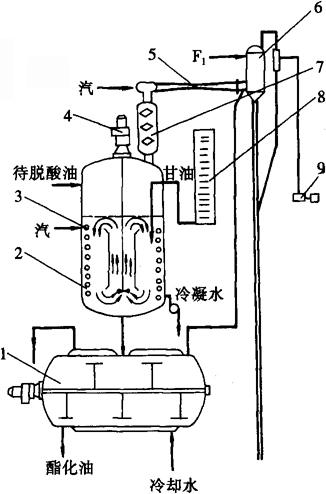 图1-3-36 物理精炼设备 1-油-水热交换器 2-析气器 3-真空泵 4-分离器 5-物理精炼塔 6-分离器 7-大气冷凝器 8-蒸汽喷射泵 9-第一、二级扩压压缩器 10-脂肪酸冷凝器 11-螺旋片热交换器 12-油-油热交换器 蒸馏脱酸往往与脱臭同时在脱臭器内进行,因而蒸馏与脱臭设备通用。单独脱臭时,真空增压器联接在脂肪酸分离器的前方,蒸馏脱酸时则联接后方。 3.2.4 酯化脱酸设备(图1-3-37) 酯化脱酸设备是一种间歇式操作设备,其中关键设备为反应罐。