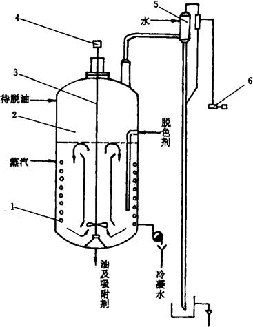 图1-3-37 酯化脱酸设备 1-冷却器 2-反应罐 3-蛇形管 4-传动装置 5-扩压压缩器 6-大气冷却器 7-回流冷凝器 8-甘油计量装置 9-真空泵 工作过程:将待脱酸油装入反应罐,并激烈搅拌,与此同时使反应罐内产生真空,并将温度升到160℃。在此温度下,将甘油及催化剂一起加入反应罐,随后缓慢加热到210~220℃。当反应物料中不再产生水时,即完成反应作用。将产品送入冷却器。一般酯化1t油,需消耗甘油12.5kg,催化剂2kg,电耗4kW·h,水耗6m3,汽耗300kg(3MPa压力)。每罐酯化时间5h。 酯化法除适用于高酸值油脂的脱酸外,也用于蒸馏脂肪酸的加工。 3.3 脱色设备 3.3.1 间歇式脱色设备 间歇式脱色设备见图1-3-38。其中关键部分是脱色塔。工作时把一定量的油装入脱色罐内,用蒸汽加热到70℃~80℃,通过大气冷凝器和真空泵的作用维持罐内真空。从升温开始到保持温度,直至油中的水分完全除去,始终要进行搅拌,此过程中该罐相当于干燥器。此后,加入计量脱色吸附剂,待吸附剂所含水分一旦挥发掉,油温加热到100~110℃,搅拌30min,然后将油和吸附剂的悬浮体泵至压滤机,进行分离。 过滤多用板框压滤机(参见第1篇第16章第1节)或振动排渣叶滤机(参见第1篇第3章第1节)进行。